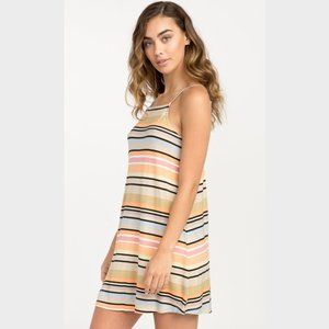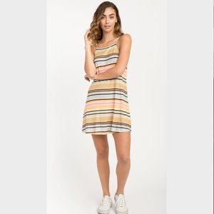 A soft dress with a silicone softner for a comfortable feel. Radiate joy and youth with it's colorful striped print and adjustable spaghetti straps. It also has a flattering halter top and a v-cut back neckline with strap detailing. Perfect for casual wear and the beach.
