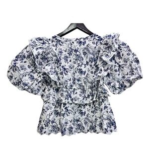 🌸 Feminine meets flirty in this dreamy ruffled blouse from Hyacinth House, sold through Tuckernuck. This romantic top features a delicate navy blue floral print on crisp white cotton, a layered ruffle yoke, and charming puff sleeves that steal the spotlight.