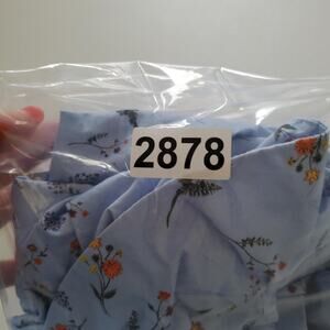 Features a light blue base with a small allover floral print featuring orange, yellow, and purple flowers.
