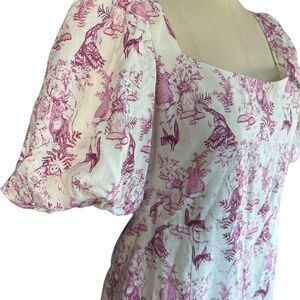 NWT! Linen blend, lined, puff sleeves, form fitting with a front slit, whimsical woodland creatures in a soft pink.
