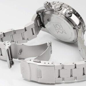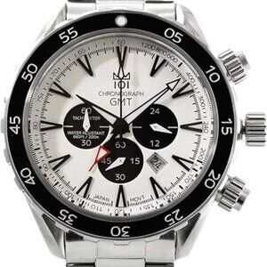 This quartz watch is brand new, never worn. It has both chronograph and GMT hand functions with a black and white dial. It is water resistant to 660 ft, with screw down crown and chronograph pushers, something typically reserved for watches costing much more. Case is 42mm wide, making the hands, GMT hand, and chronograph functions easy to read for most. Get a super accurate watch that looks much more expensive than it costs you here!