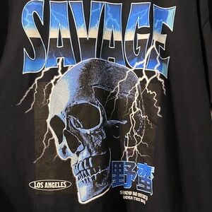 Bold black tee with striking blue graphic. Features a skull and 'Savage' text. Perfect for casual wear.