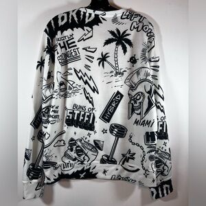 The Hybrid Legacy Crewneck Sweatshirt is a men's size large sweatshirt featuring an all-over print of the Performance Method. This stylish pullover sweatshirt is made from polyester material, suitable for all seasons including winter, summer, fall, and spring. The black and white graphic print adds a colorful touch to the design, making it a versatile and trendy addition to any man's wardrobe.