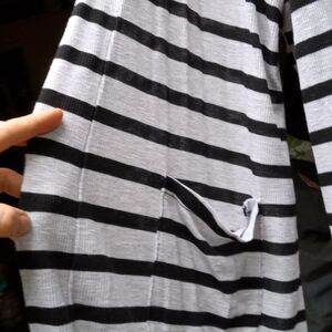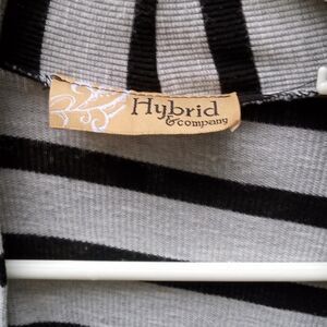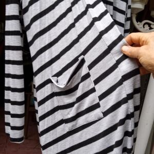 Hybrid and Company Ladies XL Long Sweater Jacket with light gray and black stripes.