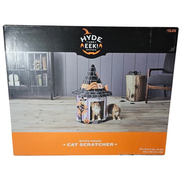 Hyde & Eek! Boutique Witch House Cat Scratcher is a Halloween-themed cat scratcher house. It is made of cardboard and features a scratchable floor to help keep a cat occupied and its claws under control. The product is designed to look like a witch's cottage with a pointed hat roof.