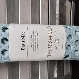 * Rectangular geometric-pattern bath mat makes an eye-catching bathroom accessory * Perforated bath mat drains water away quickly * Thermoplastic rubber construction offers long-lasting use * Suction cups hold mat in place for secure footing Description Add functional decor to your bath space with this unique and stylish Hydracell Bath Mat from Threshold™. This aqua bath mat lends chic, modern appeal to your main or guest bath, while its perforated and raised design allows water to drain away quickly. Complete the look with a coordinating shower curtain and bath accessories for a chic, cohesive style. Dimensions (Overall): 28 Inches (L), 16 Inches (W) Fabric Name: Pressed or Molded Construction Technique: Machine Made Textile Material: 100% TPR (Thermoplastic Rubber) Backing Material: 100% No Backing Fabric Weight Type: Heavyweight (550-800 GSM) Rug pile height: Flat Pile Care and Cleaning: Spot or Wipe Clean, Line Dry or Lay Flat to Dry UPC: 047968059473