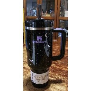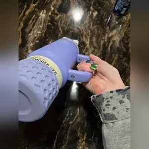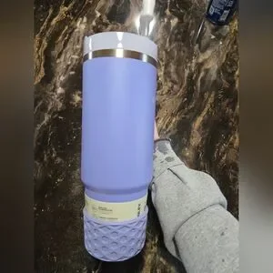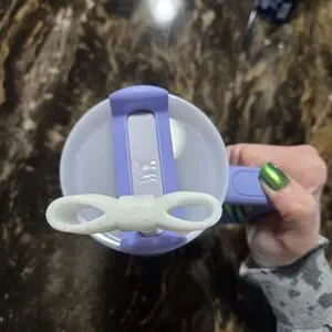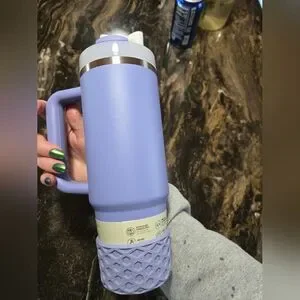 bramd new.Insulated Stanley travel mug in lavender. Secure lid with fan-top attachment. Textured base for grip. Comfortable side handle for easy carry.