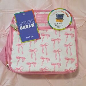 Stylish lunch tote set with pink bow design. Includes a tumbler and food jar. Perfect for on-the-go meals.