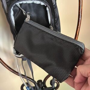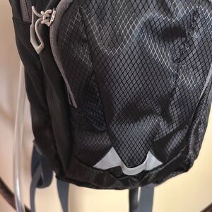 Ozark Trail black nylon hydration backpack. Looks brand new. Holds 1.5 L. Two zipper pockets, one in front has a small zippered pouch that fits inside the front pocket.