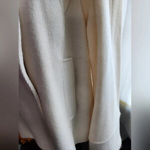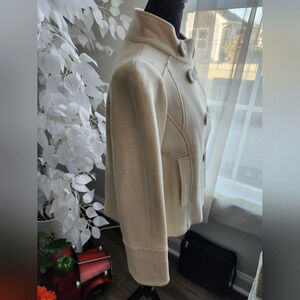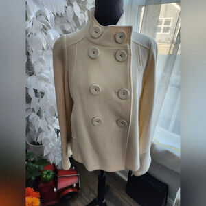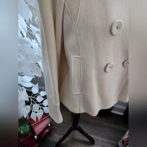 This is an off-white, double-breasted peacoat-style jacket with a high collar. It features six large buttons and two smaller buttons on the collar. The hip length jacket has a boxy fit and falls to the hip. Has a pocket on each side. Perfect for Fall and Winter.