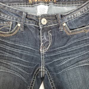 Gently used, no holes tears snags or stains. Hydraulic dark wash with whiskering, front and back pockets, zip and button closure.