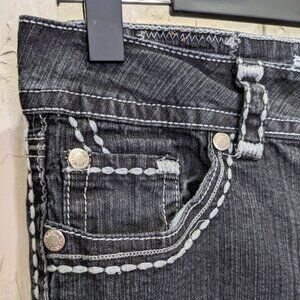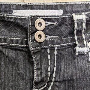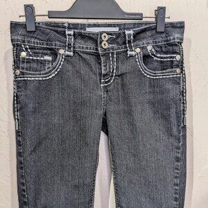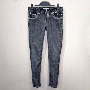 FEATURES/ACCENTS: Medium vintage wash dark gray skinny leg jeans. Stretch blend denim with heavy embroidery and embellished back flap pockets. Ultra low rise. Zip fly. 5 pocket design.