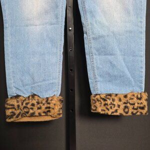 Details: Leopard print faux fur lining on cuffs, mid-rise, 5-pocket style, zip fly.