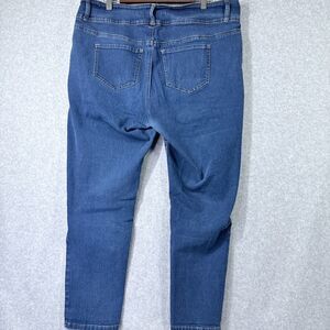 The product is a pair of Hydraulic Nolita women's size 20W high rise curvy ankle skinny stretch blue jeans. Made of a cotton blend denim fabric with a dark wash, these jeans feature a 3-button and zipper closure, a 5-pocket design, and a 27-inch inseam. The jeans are designed for a curvy fit, offering a flattering and versatile style suitable for everyday wear during the summer, fall, and spring seasons. With a high rise and stretch feature, these jeans provide a comfortable and stylish option for women looking for a plus-size wardrobe essential.