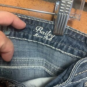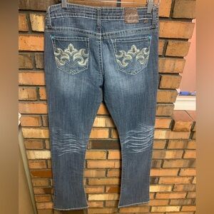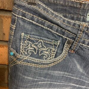 Classic straight leg jeans with a faded blue wash. Embroidered and turquoise details add style. Y2K, Size 13/14