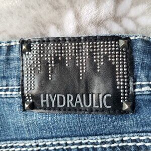 Y2K women's capri Hydraulic Gramercy blue jeans with rhinestones, contrast stitching, and embroidery details from Hydraulic, size 3-4. Looks like a few small rhinestones are missing on the back patch, but this isn't noticeable unless you're looking closely. EUC.