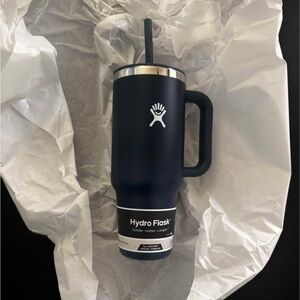 Sleek Hydro Flask travel mug. Durable and stylish. Perfect for hot or cold drinks.