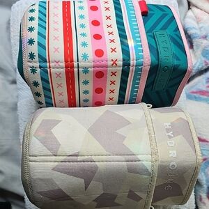 Vibrant sleeve with red, pink, and teal patterns. Neutral sleeve with cream and tan abstract design. Perfect for HydroJug enthusiasts.