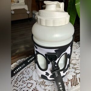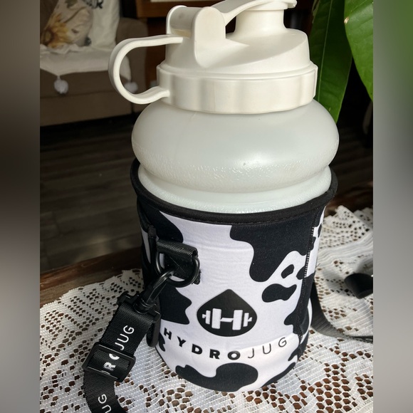 Stylish HydroJug with a black and white sleeve. Perfect for workouts and hydration on the go.