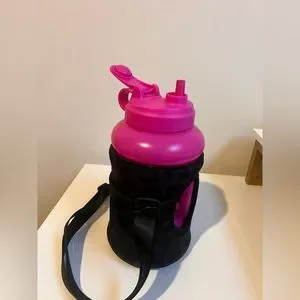 half gallon hydrojug water bottle with black leopard print sleeve and matching hot pink straw