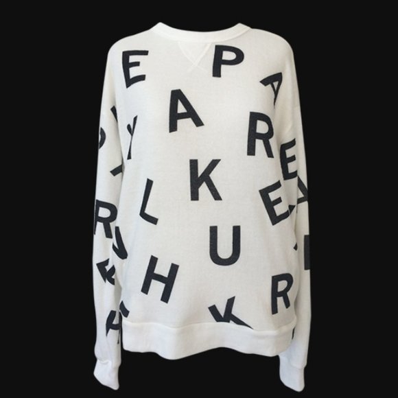 A line designed by supermodel Hye Park to bring casual comfortable effortless clothes to the market. Super soft wear everyday sweater with side pockets. White with black alphabets. You can find this line often worn by celebrities.
