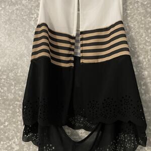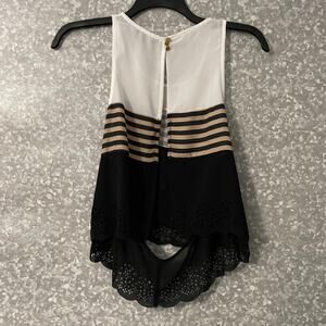 Women's color block tank top by Hyfve Hyfve Hyfve. This black and white tank top has brown stripes along the middle, a back cutout, and laser cut lace along the bottom. It is 100% polyester.
