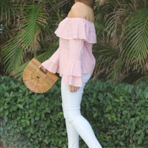 Hyfve Pink Striped Ruffle Off the Shoulder Top