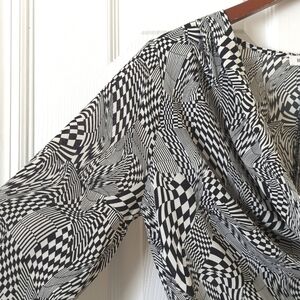 This trippy blouse features a relaxed cowl neck, long flared sleeves, a slim fitted waist, cropped length, and a zipper closure at the left side. It has an eye-catching black and white wavy checkered design. It is very lightweight, comfortable, and breathable! Perfect to pair with black high waisted leather pants! Unique, different and fun! High quality!