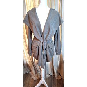 This lightweight jacket is long sleeve with a shawl collar/hood. Has elastic back waist, elastic cuffs.