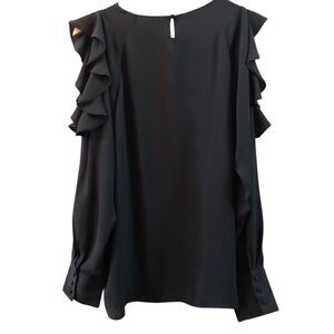 Hyfve women’s long sleeve hi lo blouse with cold shoulder and ruffles. Round neck with keyhole closure in back. Cuffs have 3 cloth covered buttons. Like new condition