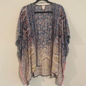Hyku Blue & Red Ombre Colorful Paisley Longline Open Front Fringe Side Kimono
