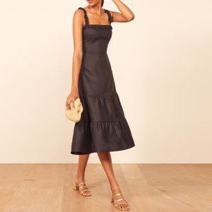 "Spring responsibly. This is a midi length dress with a straight, ruffle edged neckline, a smocked back bodice and a tiered skirt. The Hyla is slim fitting throughout the bodice with an easy fitting skirt."