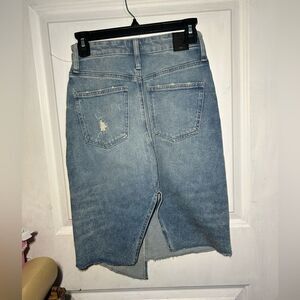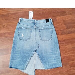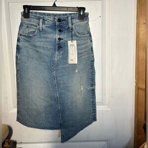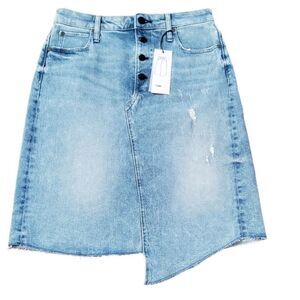 Asymmetrical Aline Denim... NWT Size 24)))Chic asymmetrical denim skirt in light blue. Features a unique design with a raw hem.