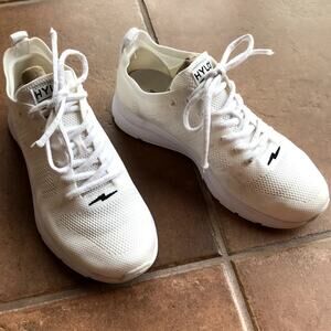 Hylo runners in very good condition, there are a few "spots" on inner left shoe towards the toe, and a faint pink mark on inner right shoe near heel - see photos. Otherwise these shoes are very clean and appear to have had little wear. They are made from a mesh that is similar to brands like Allbirds or APL but the mesh feels more like a nylon than a cloth. They are very lightweight and breathable. Unisex sizing, W 9 or M 7.5