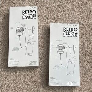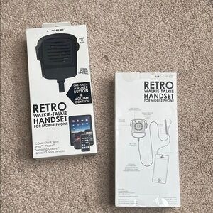 Retro walkie-talkie handset for mobile phones. Features one-touch answer button and volume control.