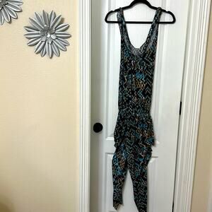 This item is in very good condition it is very stretchy measurements are shoulder down about 54 inches and armpit is about 18 inches inseam is about 20 1/2 inches. It crosses in the back and has two pockets.