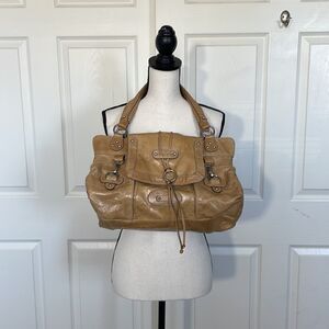Hype Tan Gold Leather Studded Shoulder Bag. Super soft leather. Two front pockets with latch closing and loop magnetic front flap closure. One slide open pocket on back. Interior has a zipper pocket and two small open pockets. Nickel color studs throughout. Leather is in excellent condition but does have two small spots on the back pocket see final picture for details. EUC