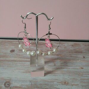 Show your support in style with these Breast Cancer Awareness hoop earrings. Designed with delicate pink butterfly charms and awareness ribbons, accented by 4mm faux pearl beads, they symbolize hope, strength, and femininity.
