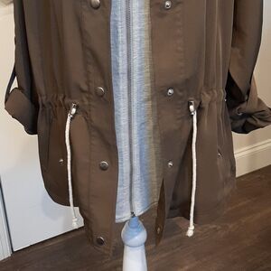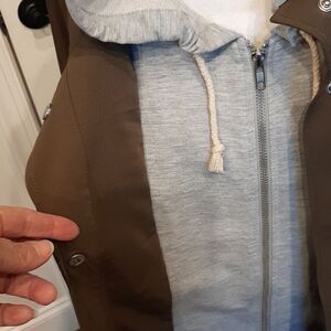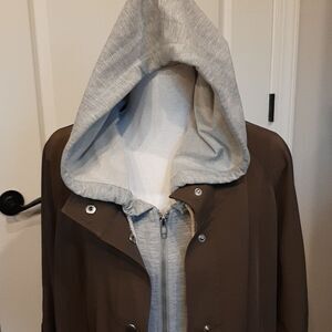 Trendy jacket with a hood. Features a drawstring waist. Perfect for casual outings.