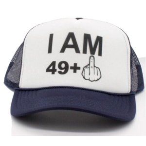 Brand New adult one size fits most. I AM 49 + 1 Trucker Vintage Style Hat with adjustable closure in the rear. Foam Hat with poly mesh back.