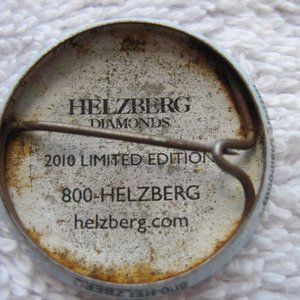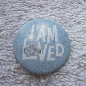 Small one inch light blue pin button reads " I am loved" with the "o" in loved being two interlocked rings. The back reads " Helzberg Diamonds / 2010 Limited Edition / 800-Helzberg / Helzberg.com