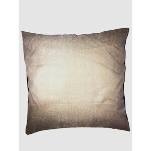 Measures approx 17"x17". The pillow appears to have feathers and/or down in the filling blend. Color is a dark gray or light black. Back is a natural color burlap or canvas. Cover zips off.