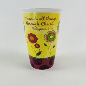 The Cyprus Home ceramic tumbler cup is a beautifully designed mug featuring a flower pattern and the Bible verse "I Can Do All Things Through Christ." This 16 fl oz cup is decorated and suitable for hot beverages, making it perfect for all occasions. With its vibrant yellow color and dishwasher-safe material, this tumbler is a great addition to your kitchen or dining room decor. Whether you enjoy coffee or tea, this mug is sure to bring a touch of inspiration and style to your daily routine.