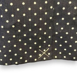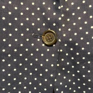This gorgeous blazer is in excellent pre-owned condition. In fact, the back vent hasn’t been cut open, so it may never have been worn. It’s navy blue with white polka dots. 5)3 buttons are plastic but have a wood look to them. The outer fabric is linen, and it is fully lined in with interior pockets. It’s super cute and will work great in spring and summer!