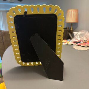 The frame is a yellow floral leafed design. It is made of composite material- not wood, not metal. The back of the frame has a velour feel to it.