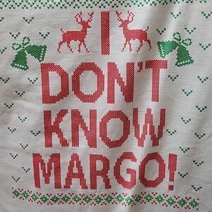 " I Don't Know Margo" saying from Lampoons Christmas Vacation. It's white with green 3/4 length sleeves. It is an adult size 2xl.