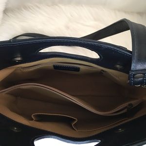 Beautiful leather dark navy blue bag made in Florence Italy. Very lightly used and a wonderful size (11 1/2” L x 13”W) with removable long strap (44”).
