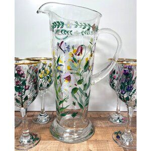 This exquisite hand-painted glass set by Godinger & Co. features a stunning floral design with gold rims. Ideal for serving beverages in style, it includes a tall pitcher and six matching goblets, each showcasing vibrant, intricate details. The elegant craftsmanship makes it a refined choice for sophisticated gatherings and dining experiences. No Chips, or cracks Pitcher is heavy. Pitcher 13'' Tall, 9.5'' Wide, including handle, Glasses 8''