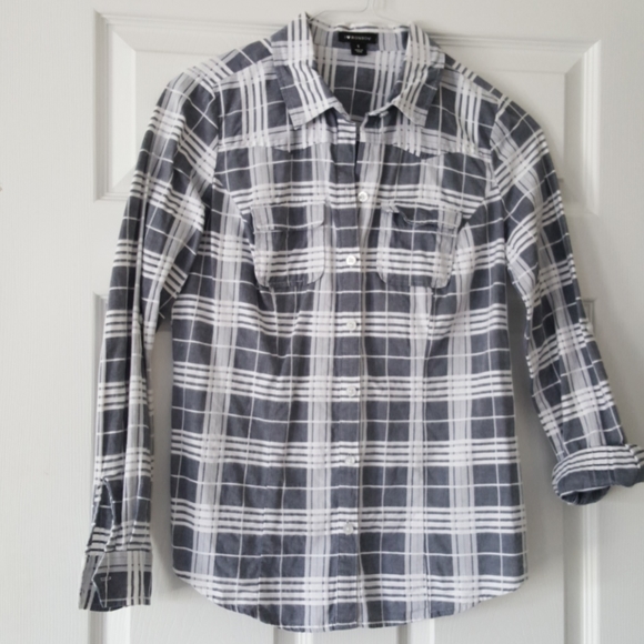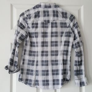 I Heart Ronson tapered plaid shirt. Dark grey and white colors. Excellent used condition, barely worn. No flaws noticed. Size Small. Material in photo.