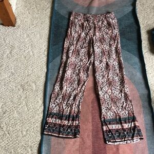 Great Preloved condition size large, wide, leg, bohemian inspired beach pants by jeans by Buffalo lightweight breathable, Hand pockets, elastic waist band waist tie , perfect for a beach day or pair with a black crop top for a casual lunch